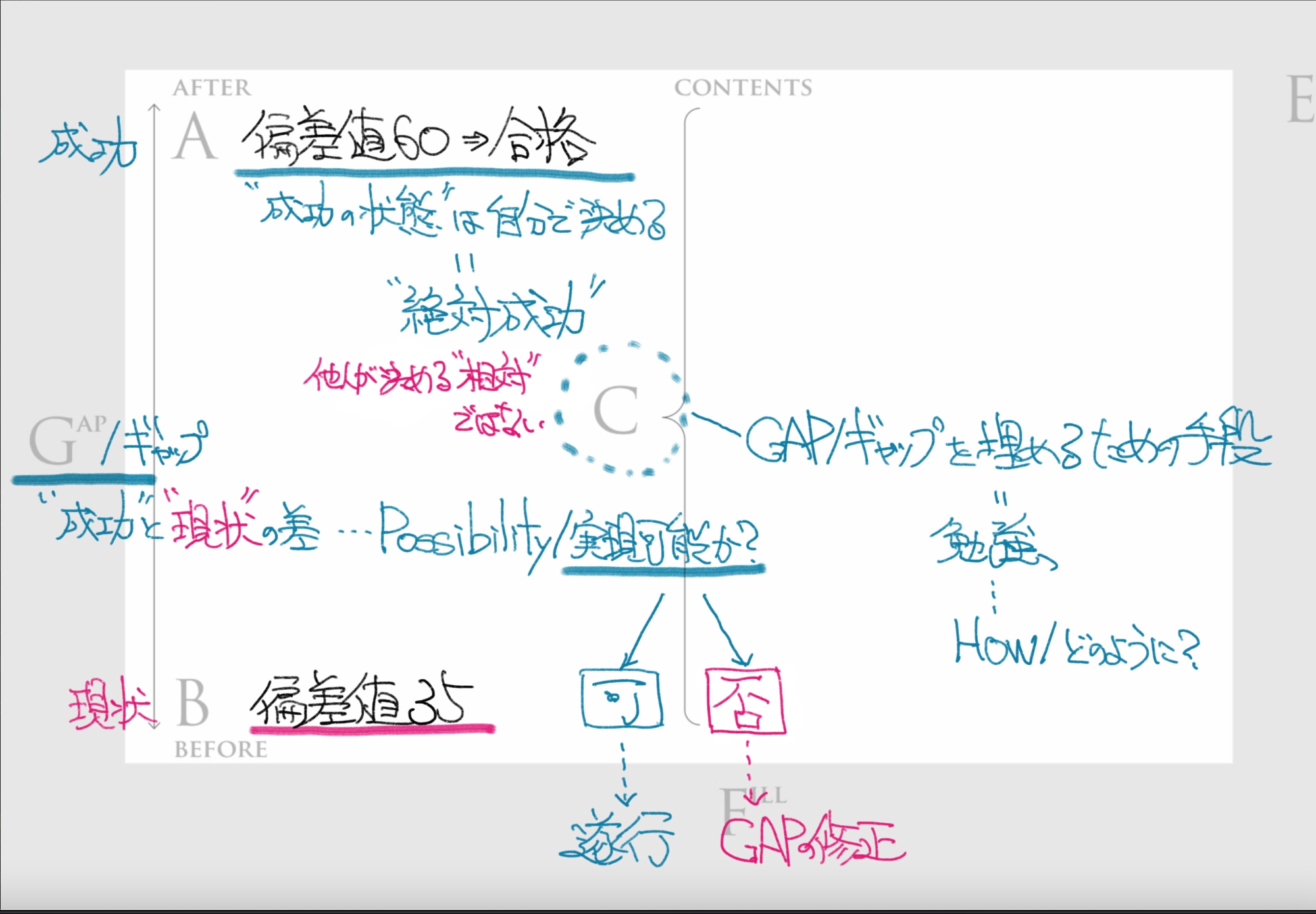 「Before 偏差値35の人」が、「After 偏差値60の人」になるには、その間にある「GAP/ギャップ」を埋める必要があります。そのために、「勉強」という手段を合理的に“遂行”しただけの話です。