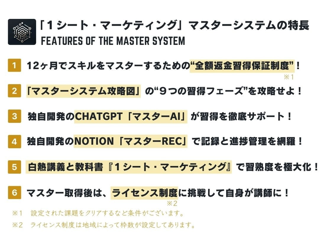 本講座「1シート・マーケティング・マスターシステム」をご受講の皆様は、この講座の習得だけではなく、このマスターAIを半永久的に使うことができます。