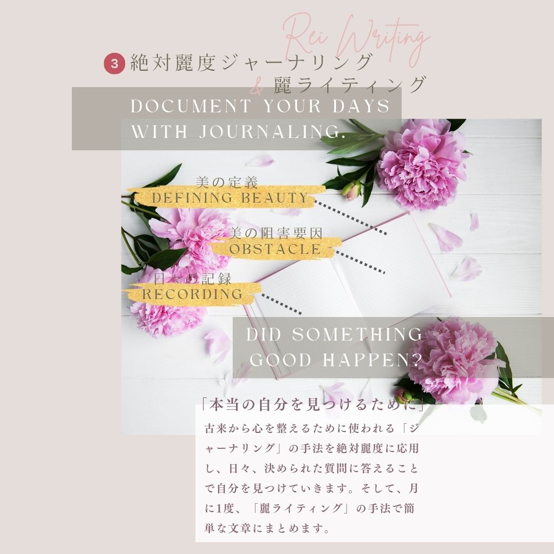 「絶対麗度ライティング」では、古来から心を整えるために使われる「ジャーナリング」の手法を絶対麗度に応用し、日々、決められた質問に答えることで自分を見つけていきます。
